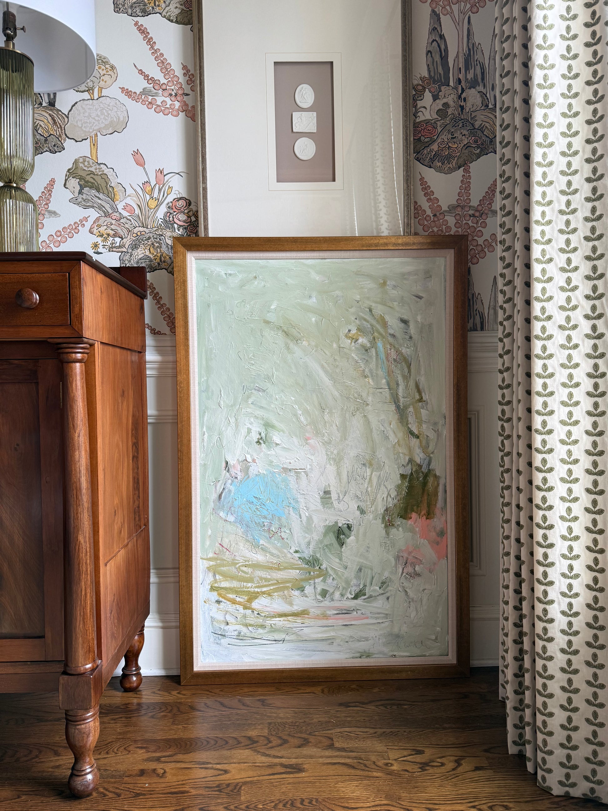 Acrylic on canvas with gold frame and linen insert. All artwork is professionally framed and ships for free